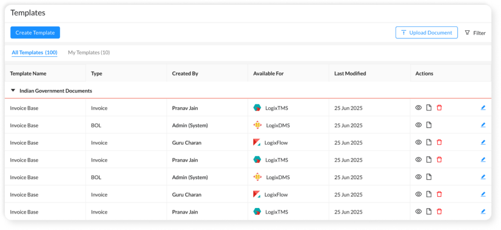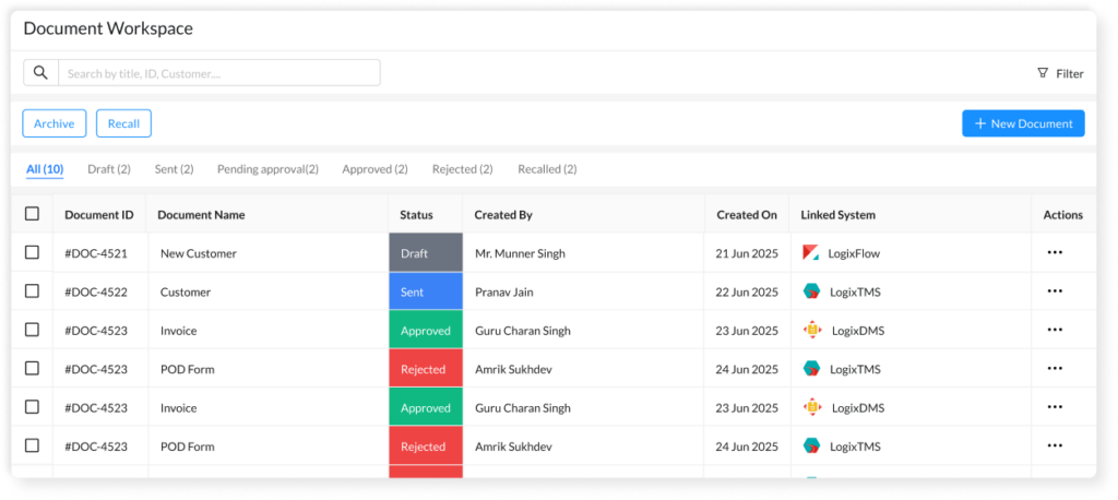 Search, preview, and manage all documents and templates — filter by status, shipment, or tags and act in bulk.
