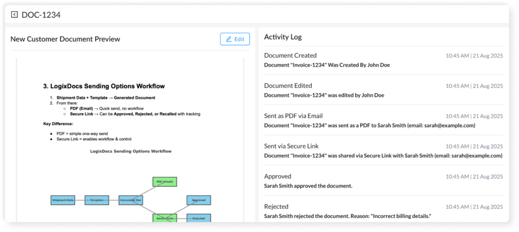 Create PDFs or recallable links, assign approvers, and track every action with full audit trails.