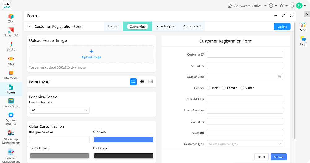 Make every form match your brand and workflow. Customize header images, form layout styles, font sizes, spacing, and color themes — all visually.